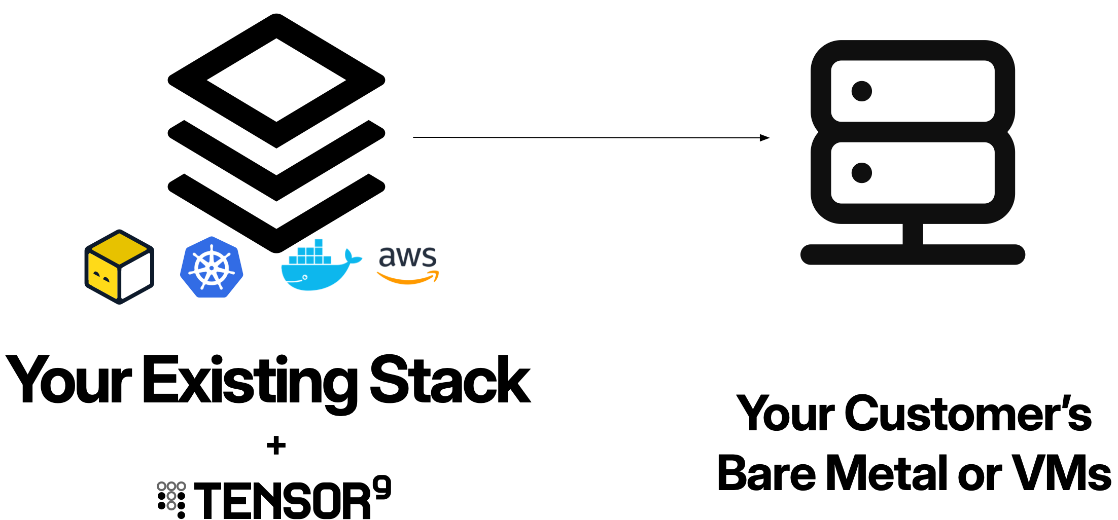 On-premises and bare metal deployments use Kubernetes as the underlying orchestration platform. Your customer installs and manages their own Kubernetes cluster on their infrastructure, and then Tensor9 deploys your application into that cluster following the same pattern as Private Kubernetes deployments. This approach gives customers full control over:- Hardware: Physical servers, storage, and networking equipment