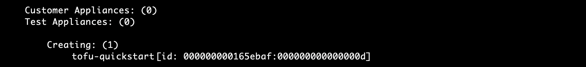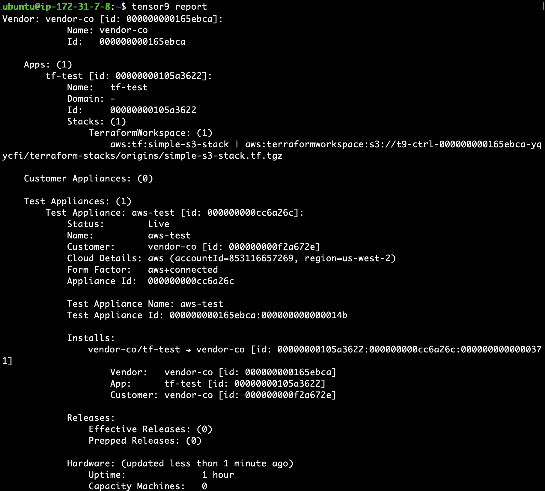 tensor9 reportto determine when your test appliance is ready for a release. While the test appliance is creating,tensor9 reportdisplays output such as: